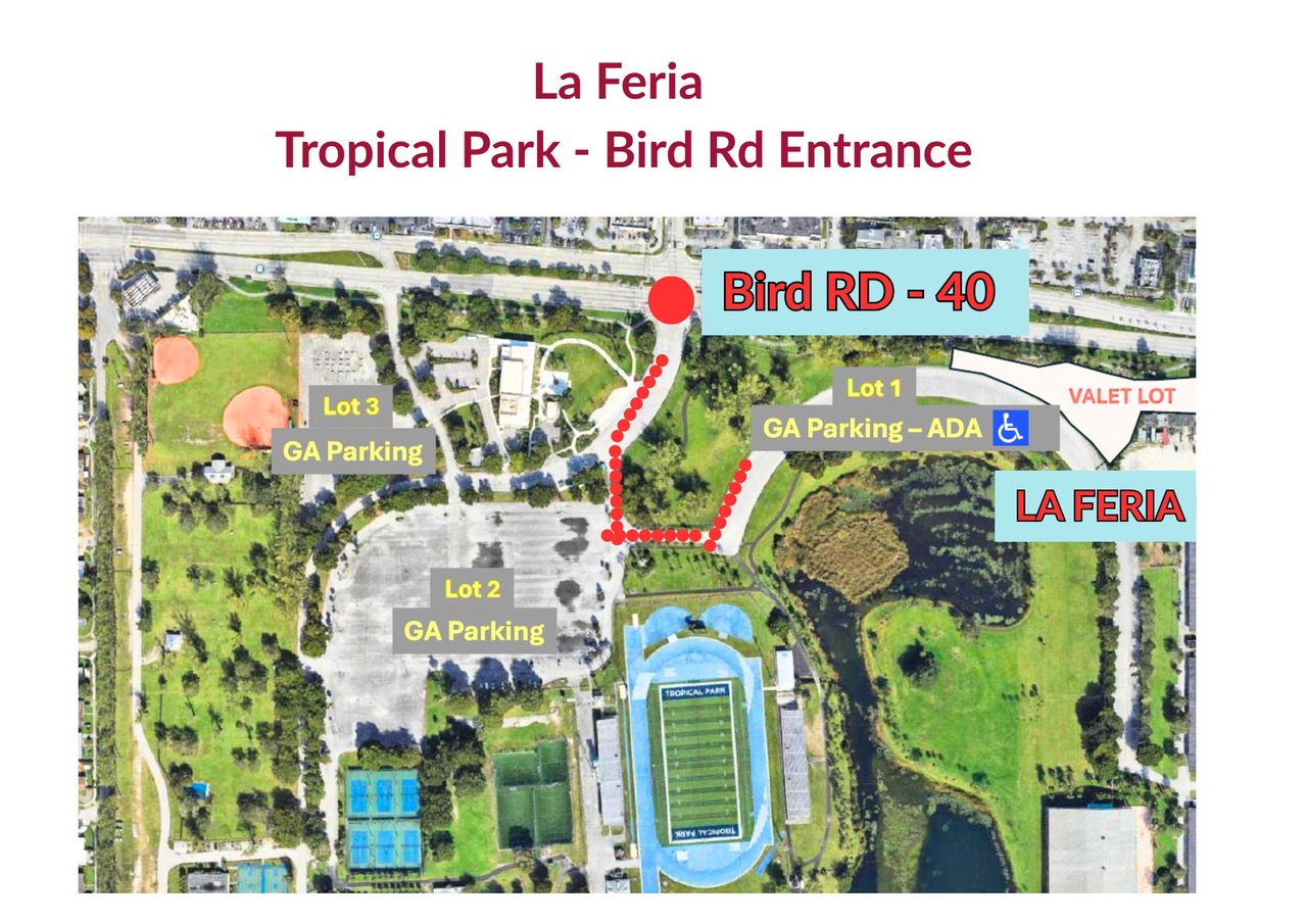 To access La Feria de Sevilla in Miami, please enter Tropical Park through the Bird Road entrance (SW 40th Street).
